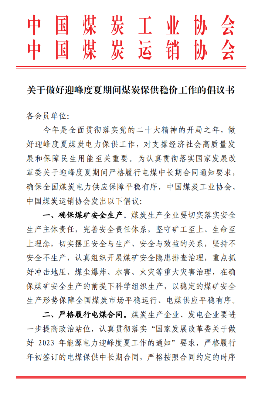倡议书提出,煤炭生产企业、发电企业要认真贯彻落实“国家发展改革委关于做好2023年能源电力迎峰度夏工作的通知”要求,严格履行年初签订的电煤保供中长期合同,严格按照合同约定的时序足额兑现履约,切实做好电煤产运需协调,提高煤炭储运支撑保障能力。