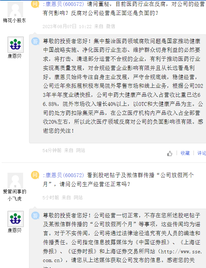 上证报中国证券网讯 康恩贝8月9日在互动平台上澄清投资者提问有关股吧帖子及某微信群传播的“公司放假两个月”等事项,公司表示,公司经营一切正常,这些传闻均为谣言。